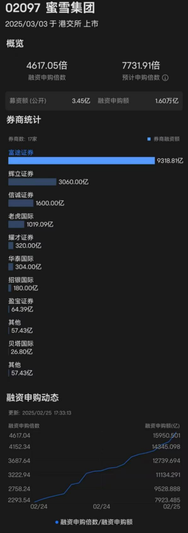 截至2月25日下午6点,据捷利交易宝数据,蜜雪冰城公开发售环节融资认购倍数达到约4600倍,认购金额达到1.595万亿港元,超越2021年2月上市的快手1.26万亿港元的认购纪录,成为港股IPO(首次公开募股)的新一代“冻资王”。