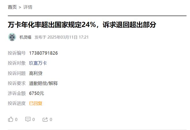 也正因为如此,玖富万卡也频遭消费者投诉。例如,黑猫投诉平台的最新投诉内容显示,有消费者投诉万卡年化率超出国家规定24%,诉求退回超出部分。