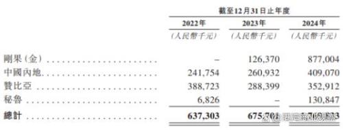 收入按地区划分而言,报告期各期,刚果(金)实现收入分别为0、1.26亿、8.77亿;赞比亚实现收入分别为3.89亿、2.88亿、3.53亿;中国内地实现收入分别为2.42亿、2.61亿、4.09亿;秘鲁实现收入分别为682.6万、0、1.31亿。