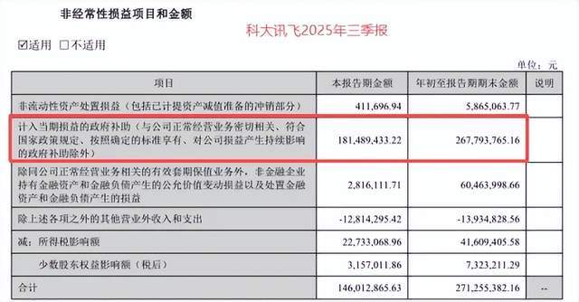 从2022年到2024年,科大讯飞计入当期损益的政府补助连续三年超40亿元,营收占比稳定在20%左右;2025年前三季度2.68亿元补贴,不仅填补了6667万元的净亏损,更撑起了三季度的盈利“高光”。