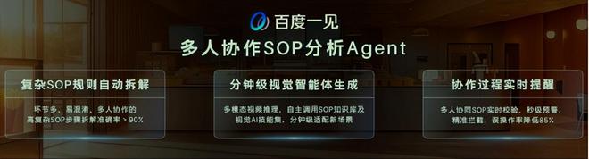 百度世界2025大会上,百度一见再次进化,将SOP分析能力拓展至连锁门店的多人协作场景,全新发布“多人协作SOP分析Agent”。该能力基于一见多模态大模型的时空定位能力,能够理解视频中的复杂时空关系,精准识别每一道菜品的完整制作工序,分析错误环节并及时提醒,有效解决连锁门店高峰期员工并行操作时出品易出错的问题。