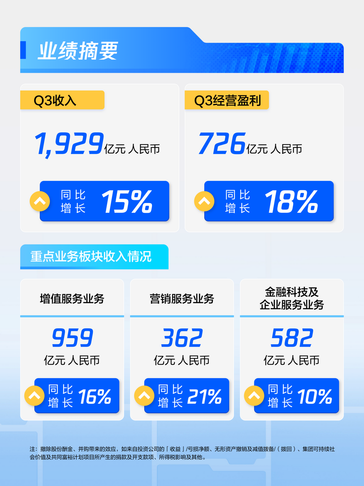 11月13日,腾讯控股发布三季度财报。公告显示,公司第三季度实现营收1928.7亿元,同比增长15%;经营利润(Non-IFRS)725.7亿元,同比增长18%。