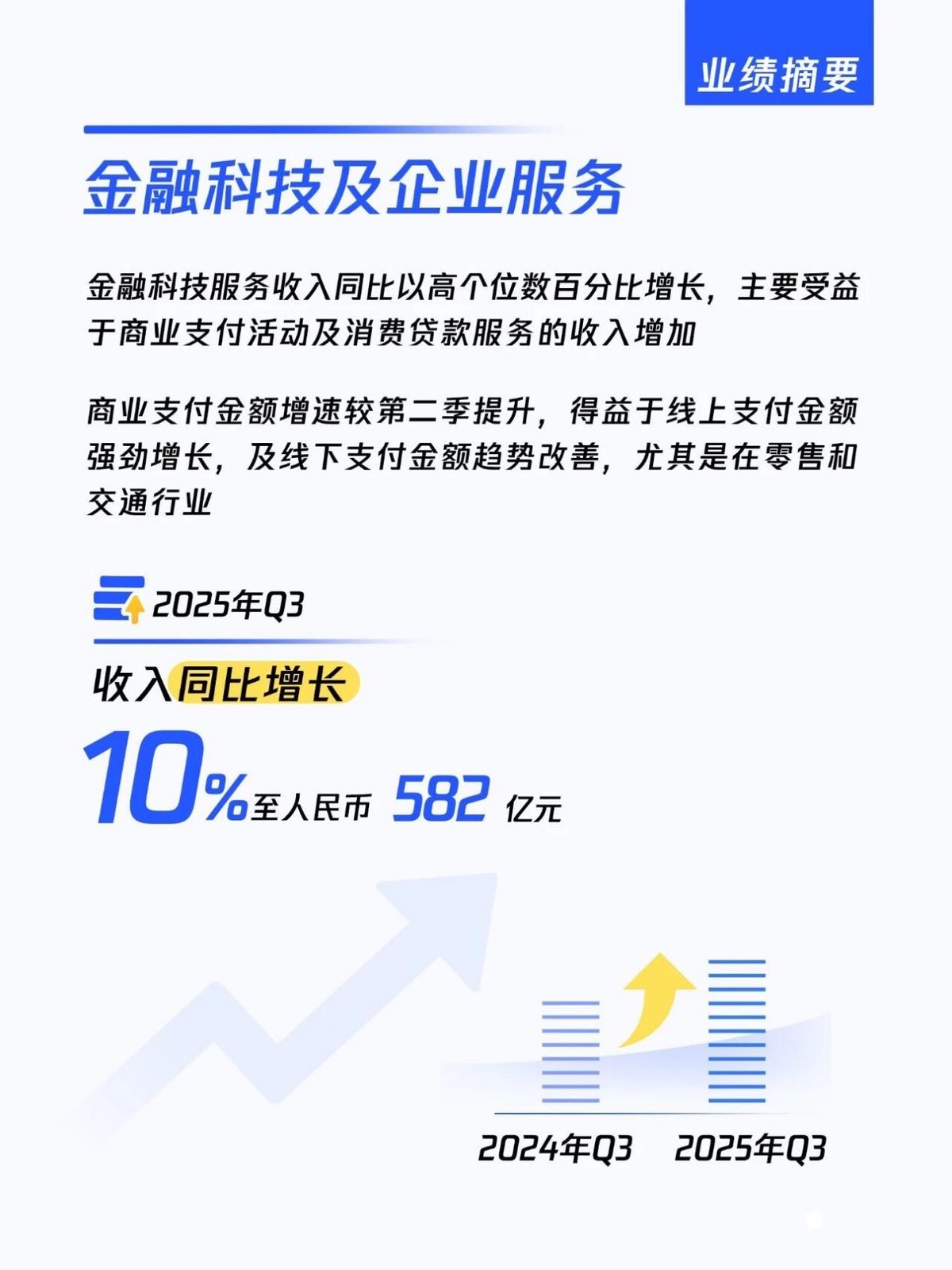 其中,金融科技及企业服务业务2025年第三季的收入同比增10%至人民币582亿元。金融科技服务收入同比以高个位数百分比增长,主要受益于商业支付活动及消费贷款服务的收入增加。商业支付金额增速较第二季提升,得益于线上支付金额强劲增长,及线下支付金额趋势改善,尤其是在零售和交通行业。企业服务收入同比增长十几个百分点,受益于云服务的收入增长(其中包括企业客户对AI相关服务需求上升带动的增长),以及由于微信小店交易额扩大而带动的商家技术服务费收入增长。