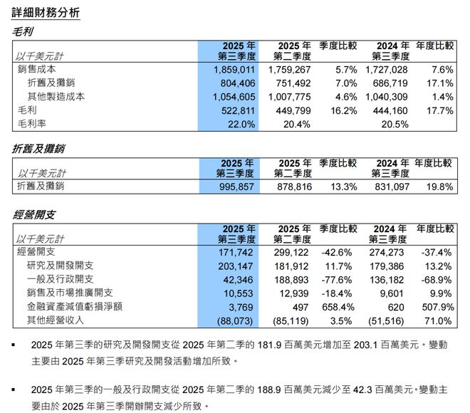 三季度,中芯国际在费用管控方面成效突出。经营开支同比减少 37.4%,环比减少 42.6%,降至 1.72 亿美元。其中,一般及行政开支大幅减少 77.6%,主要得益于开办开支的下降;销售及市场推广开支环比减少 18.4%,费用使用效率提升。