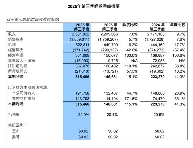 利润方面,三季度中芯国际实现本期利润 3.15 亿美元,环比大幅增长 115.1%,同比增长 41.3%;经营利润达 3.51 亿美元,环比激增 133.0%,同比增长 106.6%。基本每股盈利与摊薄每股盈利均维持在 0.02 美元,盈利质量稳固。