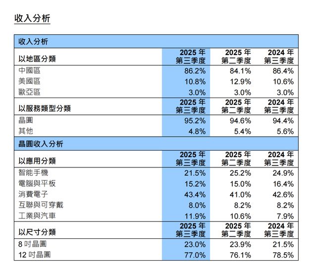 产品类型方面,晶圆代工业务持续主导,三季度收入占比达 95.2%,较上一季度提升 0.6 个百分点;应用领域中,消费电子需求最为强劲,占比 43.4%,工业与汽车领域占比稳步提升至 11.9%,较上一季度的 10.6% 和去年同期的 7.9% 持续增长,成为新的增长动力;智能手机领域占比 21.5%,电脑与平板占比 15.2%,业务结构更趋多元。