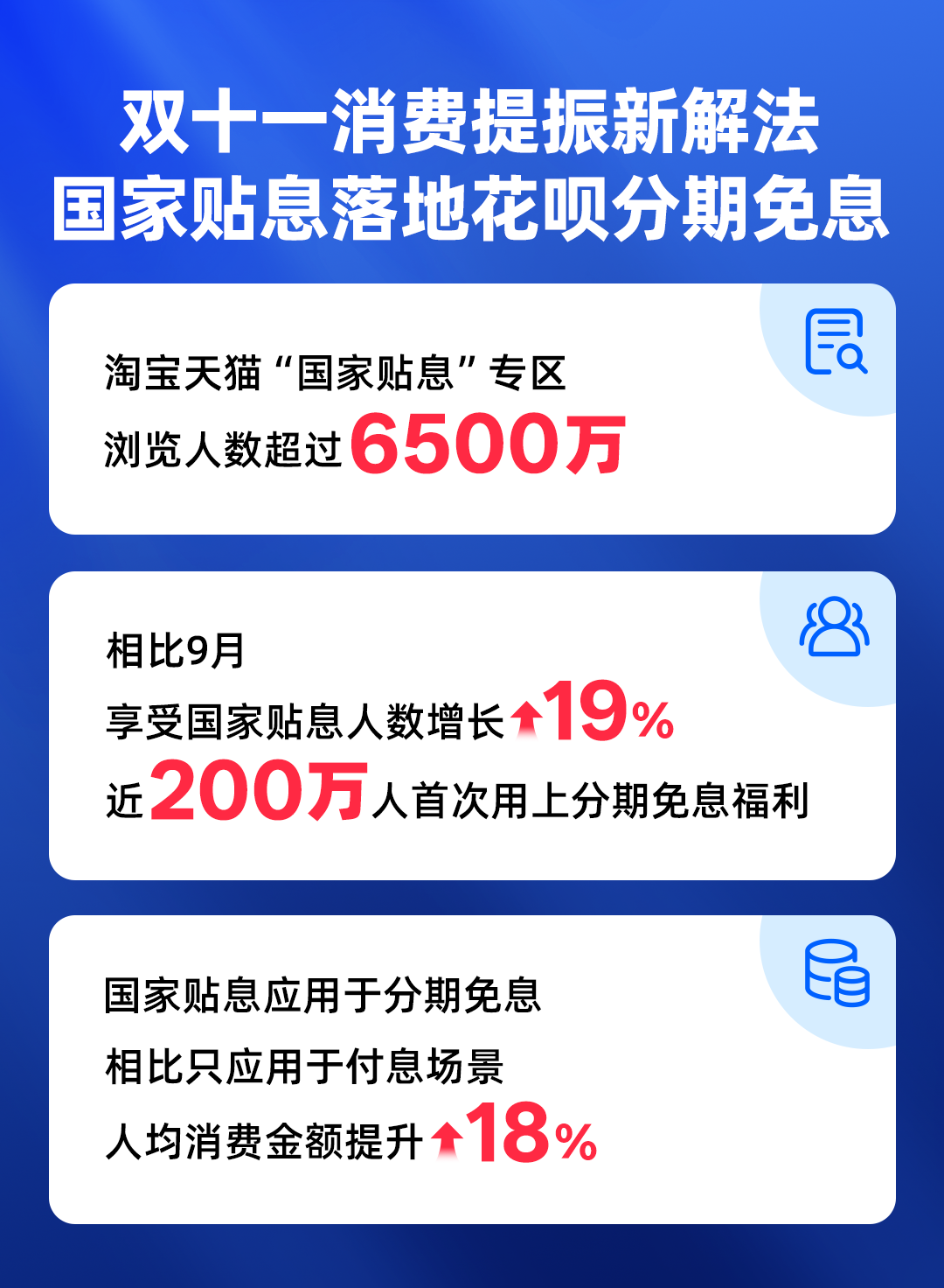 数据显示,国家贴息政策应用到分期免息场景后,消费潜力得到有效释放,双11期间人均分期消费金额较9月提升了18%,消费者更愿意消费了!