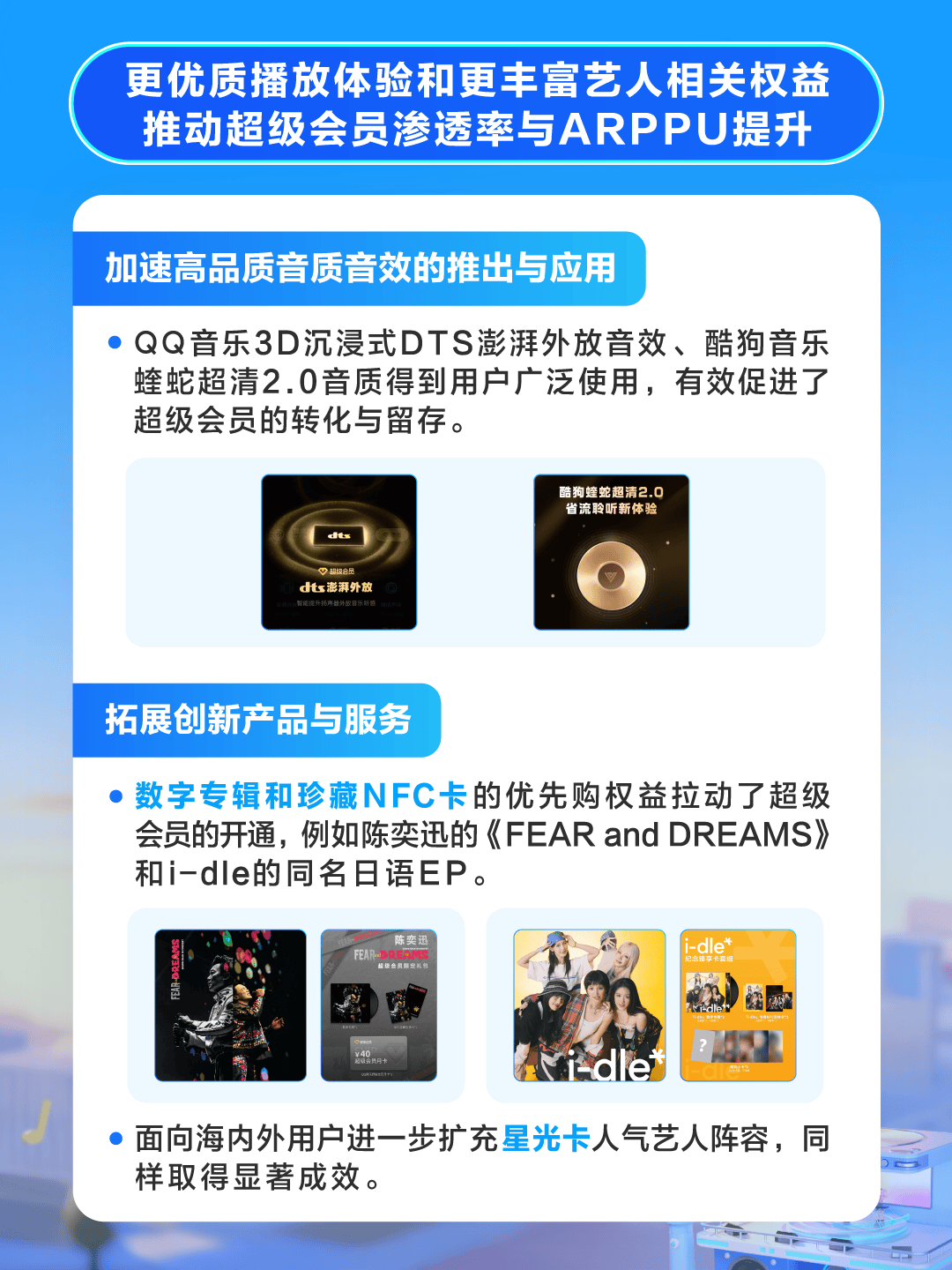 为满足用户更深层次的需求,腾讯音乐推出更多高品质音质音效与更丰富的艺人相关权益,有效促进了超级会员的转化与留存。本季度,QQ音乐新推出的3D沉浸式DTS澎湃外放音效以及酷狗音乐的蝰蛇超清2.0音质,以更沉浸的专属听感,深受超级用户青睐;数字专辑和珍藏NFC卡的优先购权益也拉动了超级会员的开通,例如陈奕迅的《FEAR and DREAMS》 和i-dle的同名日语EP。此外,腾讯音乐持续完善多层级的会员体系,新推出的广告会员对免费用户的吸引力不断增强,平台用户活跃度进一步提升。