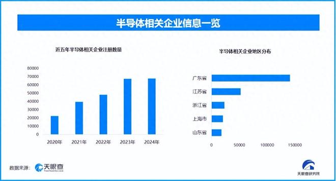天眼查专业版数据显示,截至目前我国现存在业、存续状态的半导体相关企业超39.8万家。其中,2025年截至目前新增注册相关企业约7.1万余家,从企业注册数量趋势来看,近五年间,半导体相关企业的注册数量呈现出逐年增长的态势,并在2024年达到顶峰。