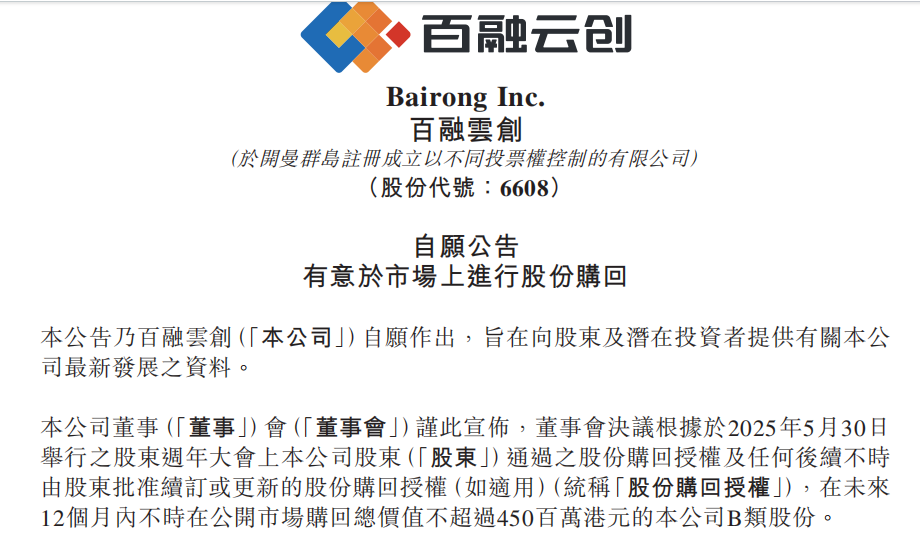 如果一家企业都不敢做多自己,投资人大概率不会相信它口中的各种童话故事。试想一家公司如果没有资金、没有意愿相信且做多自己,怎么能说服别人相信它的AI叙事?而百融云近日的这则4.5亿港元的自愿性回购公告,以及对应单日高开近5个点的涨幅,或许透露着更多人开始关注到它的新一轮AI叙事,并且选择做了“先信资本”。