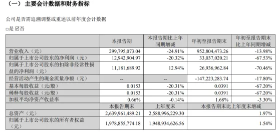 其中第三季度,公司营业收入为3亿元,同比下降24.91%;归母净利润为1294万元,同比下降20.32%;扣非归母净利润为1118万元,同比上升12.94%。