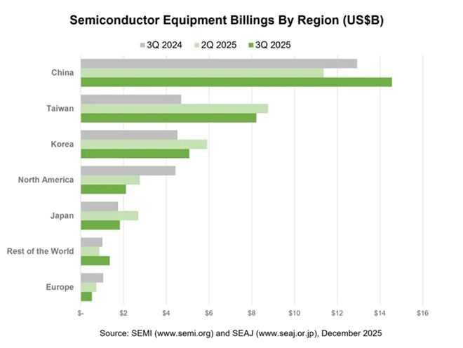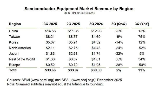 SEMI今天在其《全球半导体设备市场统计报告》(WWSEMS)中宣布,2025年第三季度全球半导体设备出货量同比增长11%,达到336.6亿美元。2025年第三季度出货量环比增长2%。
