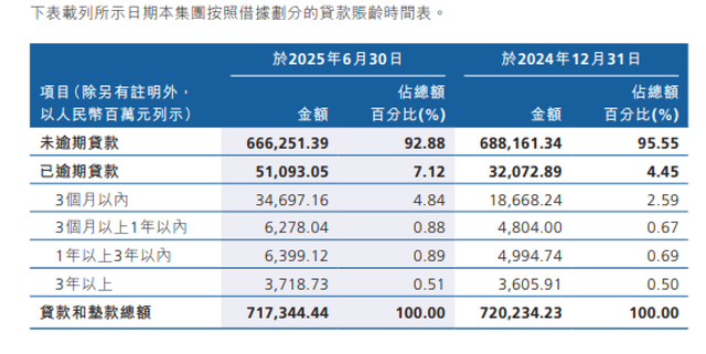 另外一个值得关注的是广州农商行的逾期贷款规模还在增长。2025年上半年末,该行已逾期的贷款金额达510.93亿元,较2024年末增长了190.2亿元,逾期贷款占比升至7.12%,创2017年上市以来新高。