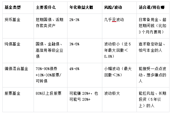 稳健基金不是“保本不亏”,而是风险小、收益稳、波动少的基金,核心靠“底层资产”撑着。不同基金的稳健程度差别很大,一张表帮你看明白: