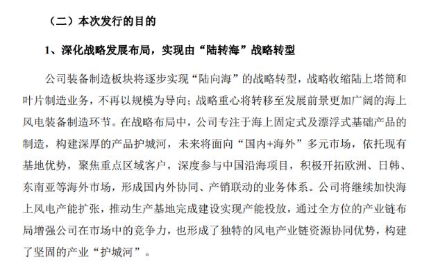 借助本次定增,天顺风能拟加码海上风电装备制造、重型海工码头及特种运输船舶等领域,在阳江、射阳等七大沿海区域布局海工基地,同时开拓欧洲等海外市场,并战略收缩低毛利陆上业务。