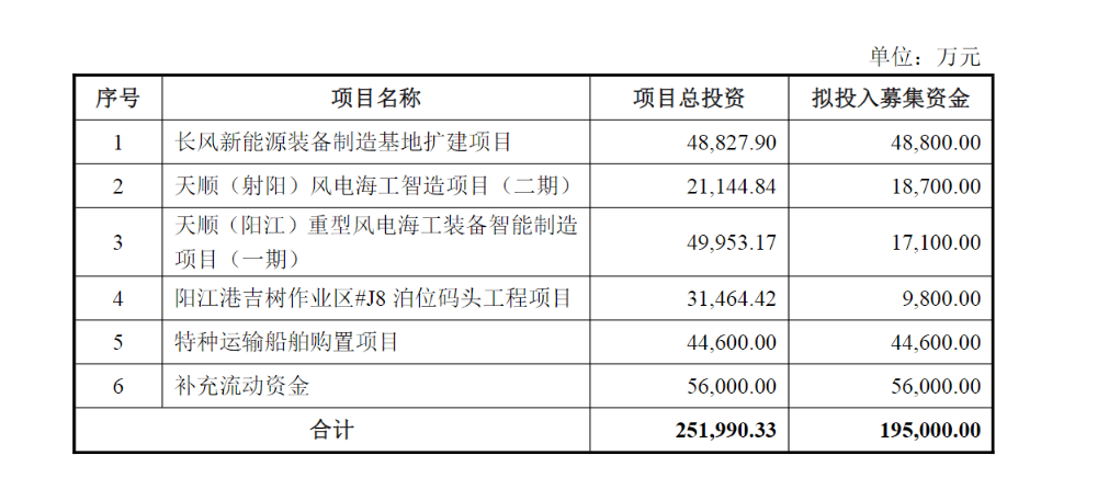 12月13日,$天顺风能(SZ002531)$披露2025年度向特定对象发行A股股票预案,募集资金总额不超过19.5亿元,扣除发行费用后将全部用于长风新能源装备制造基地扩建项目、天顺(射阳)风电海工智造项目(二期)、天顺(阳江)重型风电海工装备智能制造项目(一期)、阳江港吉树作业区#J8泊位码头工程项目、特种运输船舶购置项目、补充流动资金。