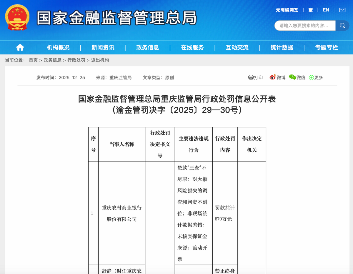12月25日,国家金融监督管理总局重庆监管局行政处罚信息公开表显示,重庆农村商业银行(渝农商行),因贷款“三查”不尽职;对大额风险损失的调查和问责不到位;非现场统计数据差错;未核实保证金来源;滚动开票等,被罚款870万元。