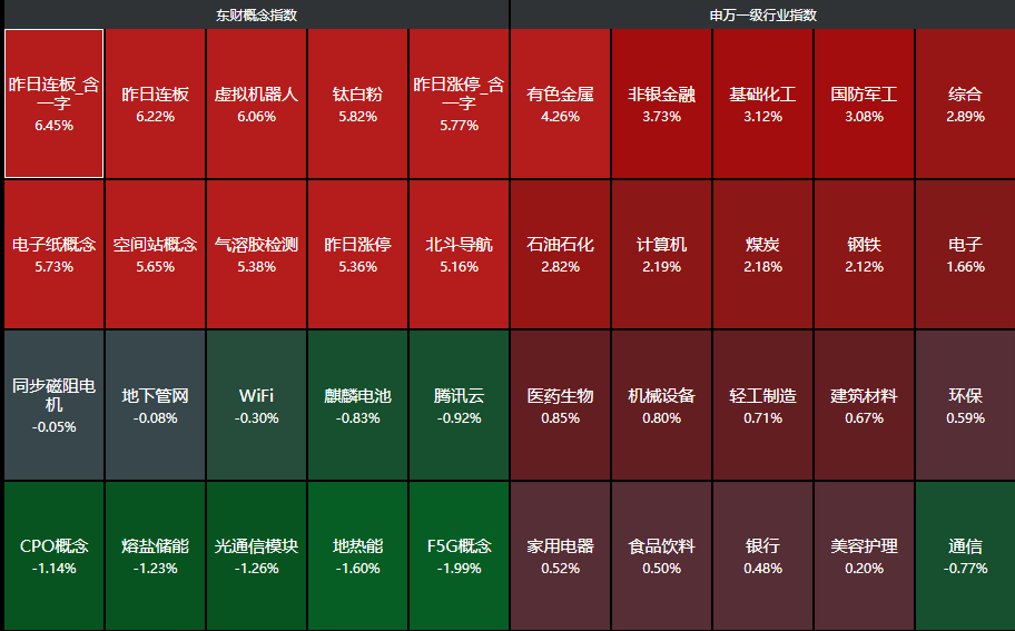 分行业来看,有色金属、非银金融、基础化工、国防军工、综合等行业领涨,仅通信板块下跌。