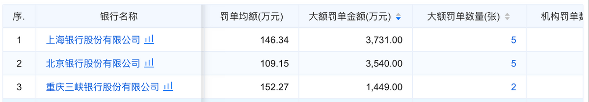 在80家城商行中,上海银行、北京银行和重庆三峡银行的大额罚单金额排名前三,被罚金额分别为3731万元、3540万元和1449万元。