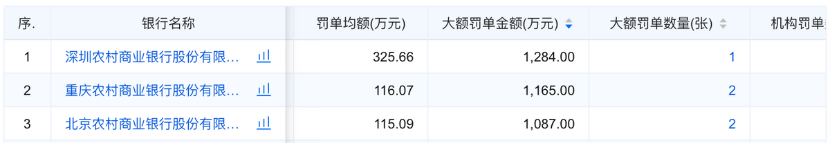 在563家农商行中,深圳农村商业银行、重庆农村商业银行和北京农村商业银行的大额罚单金额排名前三,被罚金额分别为1284万元、1165万元和1087万元。