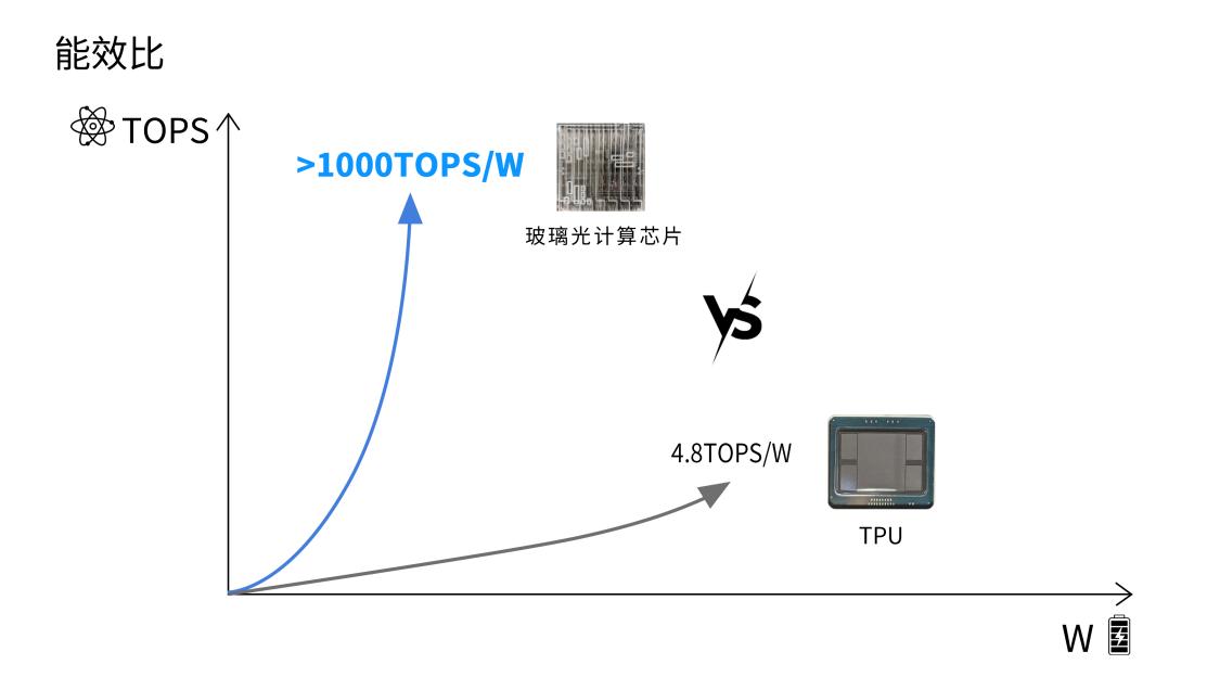 能效比方面,光本位科技利用相变材料的非易失性实现了光计算芯片零静态功耗,只需一次电驱动即可执行完一个AI计算任务。由于玻璃的非线性光学效应极弱,因此光的波导传播损耗极低,在芯片设计时可选择小功率的激光器,此外玻璃在介电损耗、透光率、平整性、热稳定性等方面的优势也能进一步降低芯片功耗。程唐盛预测,200mm×200mm玻璃光计算芯片的能效比可以超过1000TPOS/W,相当于TPU的200倍以上。