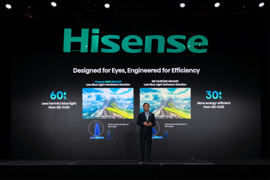 通过光源和光色同控进化,海信电视RGB-Mini LED实现了有害蓝光比QD-OLED降低60%,比传统QD-Mini LED降低75%,能耗降低30%,保证用户观看体验的同时做到护眼,还能实现超高画质与超低功耗的统一。