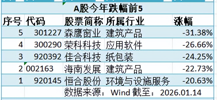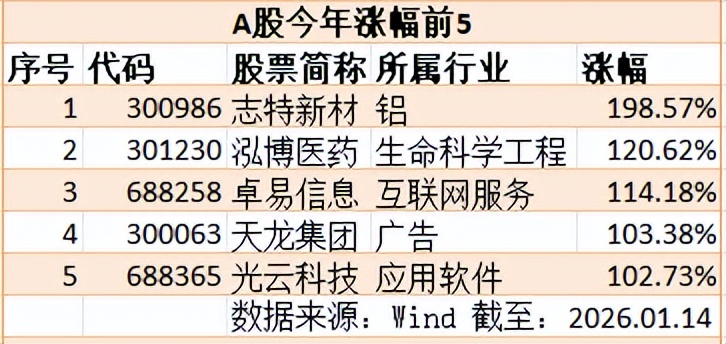 Wind数据显示,截至1月14日收盘,开年以来京沪深三市有7只个股(不含刚上市的新股)股价翻番,同时也有5只个股(不含ST类股票)跌幅超过20%。两者之间,最大反差竟然高达230%。