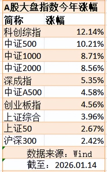 Wind数据显示,截至2月14日收盘,沪深大盘指数中,开年以来表现最好的科创板综合指数,涨幅高达12.14%,涨幅最小的沪深300也有2.42%。