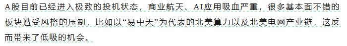 前几天的文章主要提了两个观点:其一,A股进入极致投机的状态,要小心管理层降温;其二,由于市场投机盛行,题材股对部分有业绩的板块吸血,这反而带来了机会。而这两点在这两天得到了兑现,昨天证监会提高融资保证金比例,商业航天、AI应用跳水,但是半导体、北美算力、电网设备等板块却大幅走强,特别是今天午盘半导体设备、光模块、pcb上游材料等细分板块爆拉,中际旭创一度涨超7%,特变电工涨超6%。