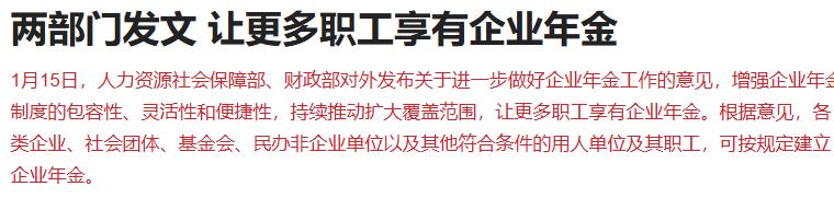 人力资源社会保障部、财政部对外发布关于进一步做好企业年金工作的意见,增强企业年金制度的包容性、灵活性和便捷性,持续推动扩大覆盖范围,让更多职工享有企业年金。根据意见,各类企业、社会团体、基金会、民办非企业单位以及其他符合条件的用人单位及其职工,可按规定建立企业年金。
