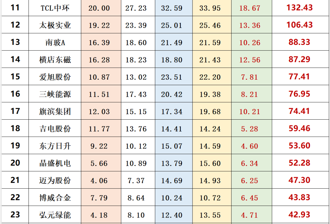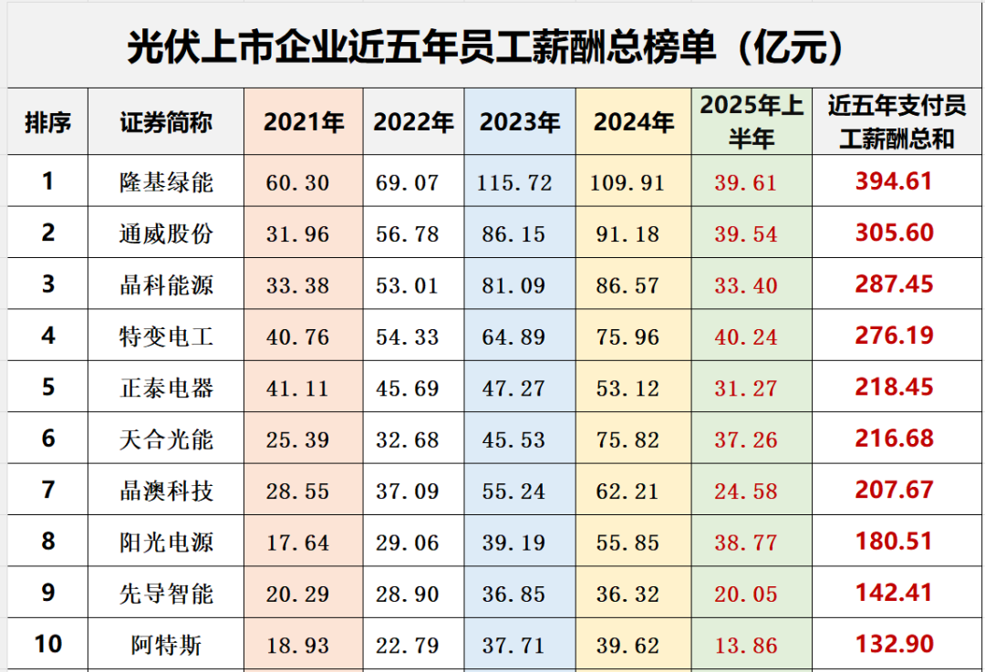从2021-2025年上半年,125家A股上市企业累计给员工的薪酬支出为4740亿元。四年半时间里,累计为员工支出薪酬最多的十家企业依次为隆基绿能、通威股份、晶科能源、特变电工、正泰电器、天合光能、晶澳科技、阳光电源、先导智能和阿特斯。其中隆基绿能达395亿元,通威股份306亿元,晶科能源287亿元,居前三甲。