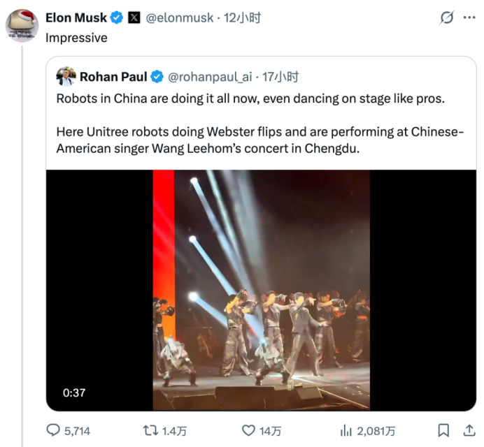 宇树G1机器人在模仿战斗动作时不慎给工程师"恶毒"一脚,他评论"笑哭"表情包;六台宇树人形机器人为王力宏演唱会伴舞,精准完成高难度"韦伯斯特空翻",他不仅转发至X平台更评价"令人印象深刻";小鹏IRON首秀视频中拟人化走姿引发关注,他点赞并直言"特斯拉与中国公司将主导市场"。