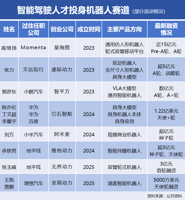 来源 | 汽车产经 导语:从智能驾驶领域到具身智能领域,一场“人员迁徙”正在进行。2025年,机器人行业的一家成立刚两年的初创企业,在8个月内完成7轮融资,累计金额达数十亿元,目前估值突破10亿美元,跻身独角兽行列。