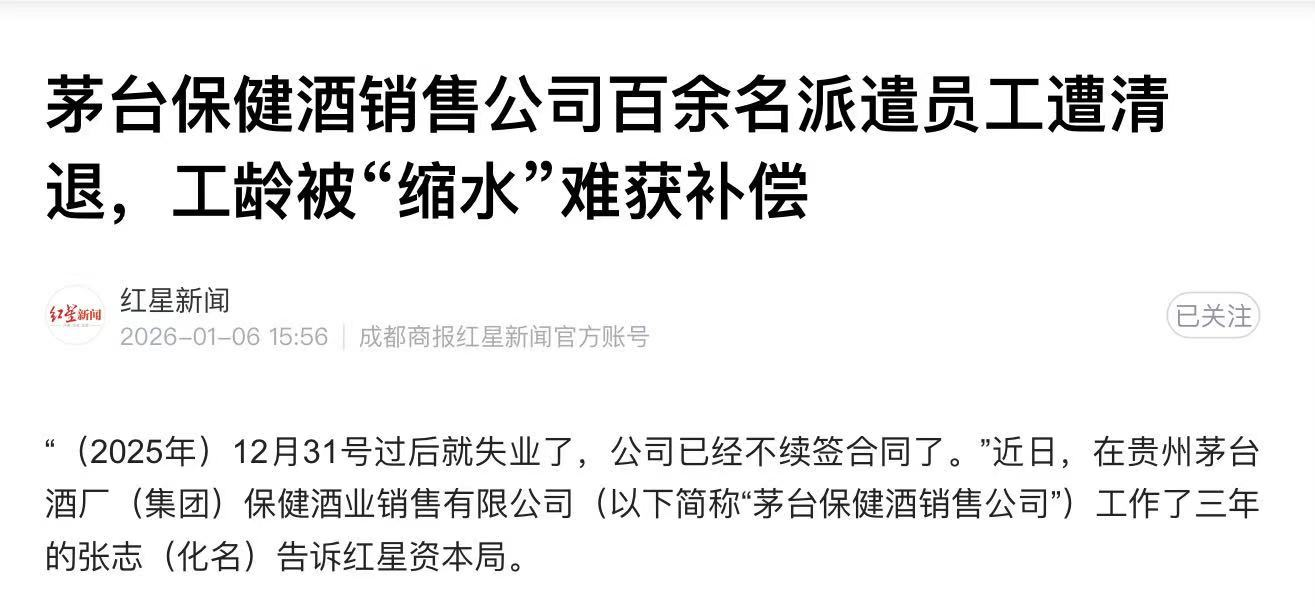 根据红星新闻的消息,2026年元旦刚过,茅台保健酒销售公司的上百名劳务派遣工,因为公司将不再跟他们续签新的劳动合同,将因此陷入失业状态。