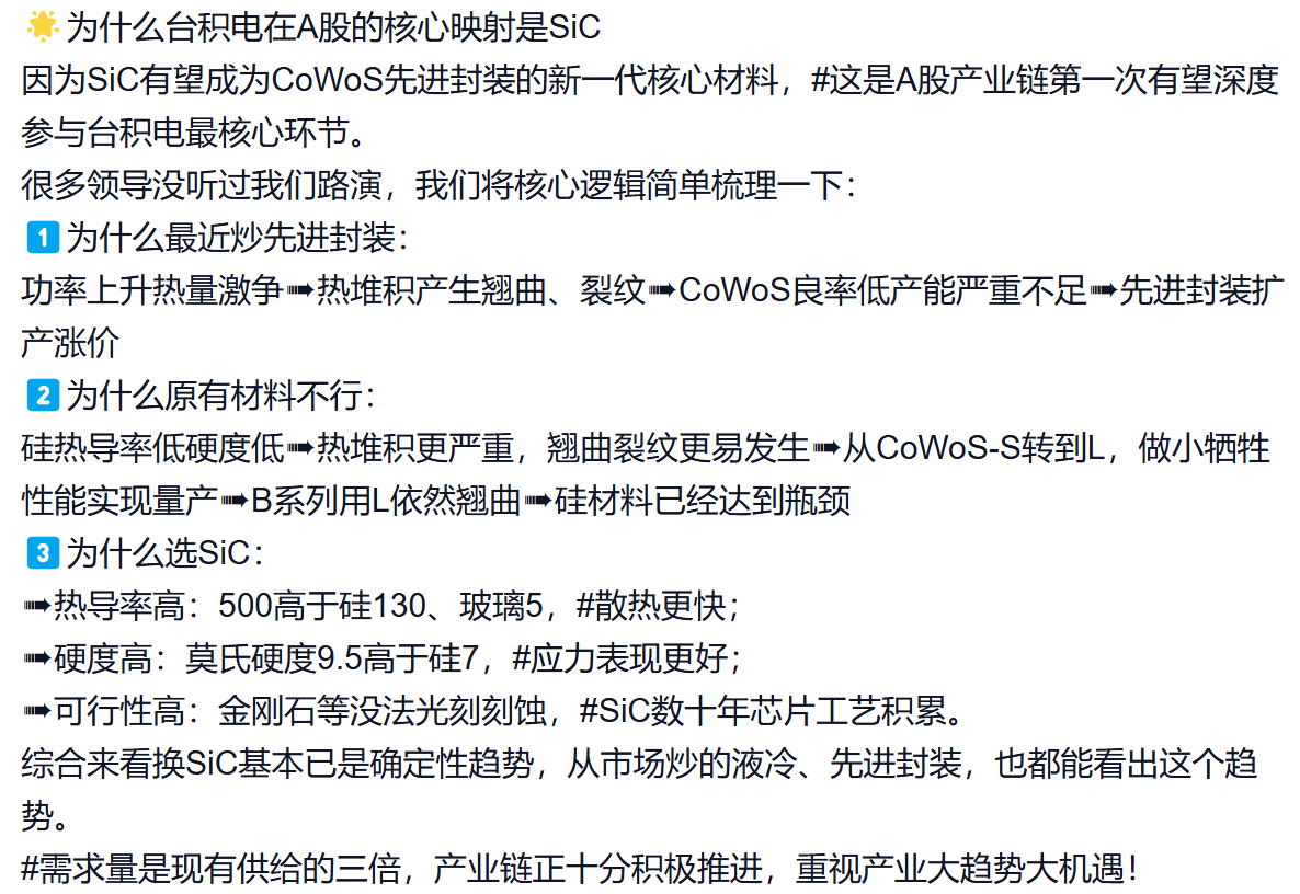 第一,结论先行,且结论相当笃定。例如认为台积电采用SiC作为CoWoS中介层Interposer的材料,基本已是确定性趋势,且市场空间非常之大。