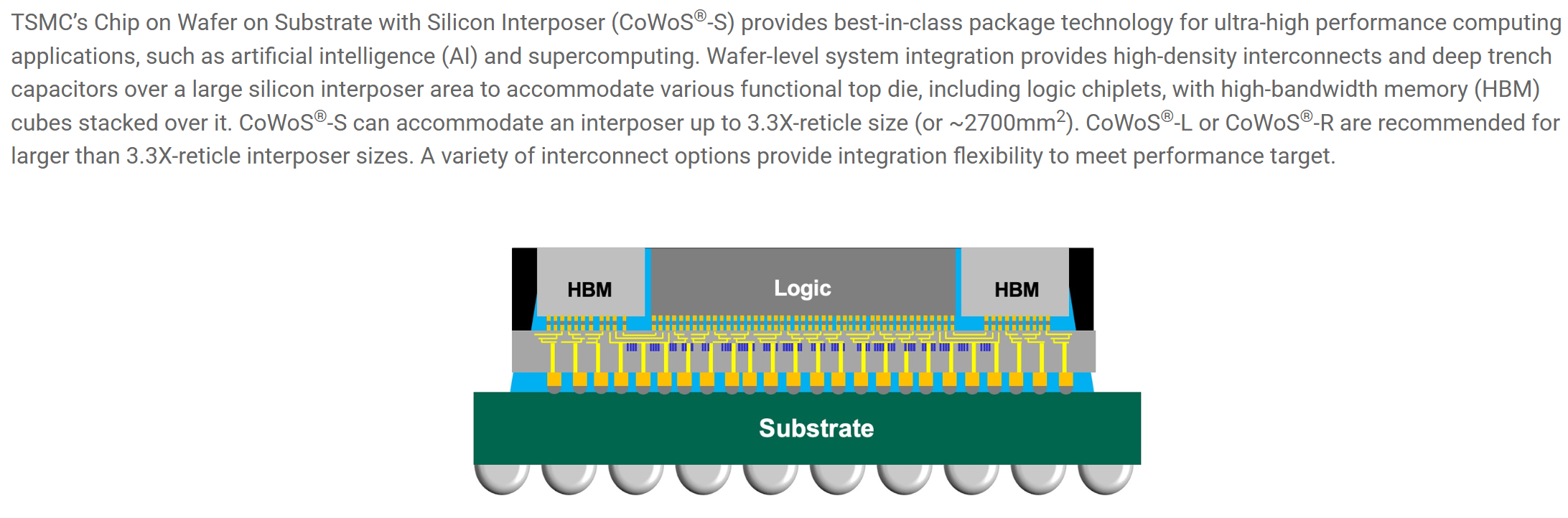 在AI爆发之前,市场并不太关心封装工艺,但AI训练和推理都需要海量数据,传统的计算架构中,内存距离GPU太远、速度太慢,台积电开发的CoWoS工艺允许将HBM直接紧贴着GPU放在同一个中介层Interposer上,极大地缩短传输距离并提升了带宽。