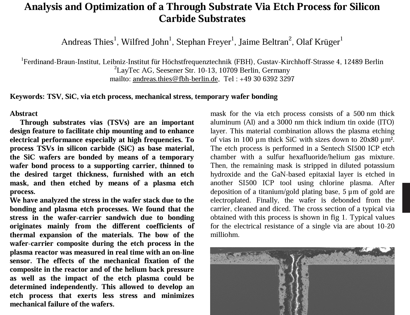 例如,NASA & IEEE Conference曾于Journal of Vacuum Science & Technology B发表文章《Deep Reactive Ion Etching of Silicon Carbide》,文章摘要中明确指出,在优化的SF6/O2等离子体环境下,SiC的最大蚀刻速率约为每分钟0.45m,同时在论文中指出,标准硅的DRIE蚀刻速率通常不低于每分钟20 m甚至更高。