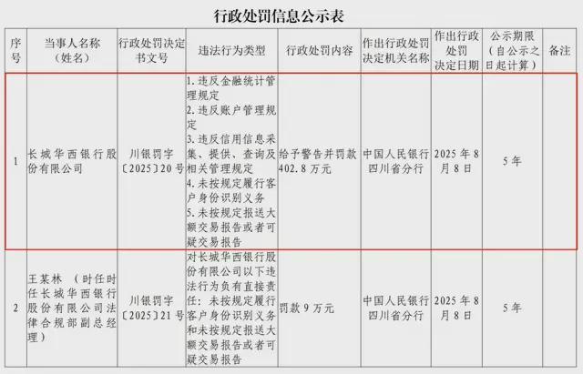 2025年8月,长城华西银行因违反金融统计、客户身份识别、大额交易报告等多项核心规定,被处以402.8万元重罚。