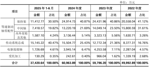 其中,腾励传动主要产品类型包括等速驱动轴零配件及传动系统总成类产品,上述产品的期内合计收入分别为4.64亿元、5.46亿元、5.68亿元、3.56亿元,占主营业务收入的比例分别为92.75%、91.27%、93.13%和95.04%。腾励传动的业务高度聚焦于汽车传动系统领域,核心业务的营收贡献占比极高,产品结构单一的隐忧渐显。若未来等速驱动轴相关市场供求波动或行业竞争加剧,公司或面临盈利能力下滑、抗风险能力不足的挑战。