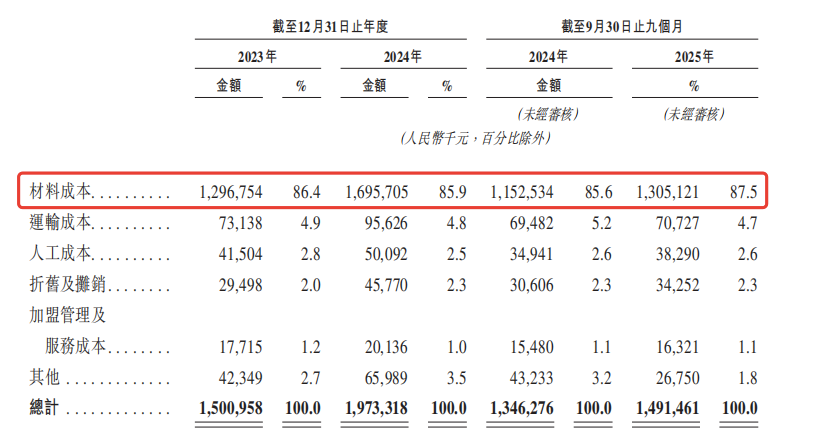 根据招股书,2023年、2024年及2025年前9个月,袁记食品收入分别为 20.2 亿元、25.6 亿元、19.8 亿元。2024年和2025年前9个月的收入同比增速分别为26.4%、10.9%。