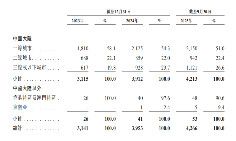 从袁记食品国内门店分布来看,2023年到2025年前9个月,一线城市门店占比从58.1%下滑至51.0%。这表明袁记被迫向毛利更薄、消费力不稳定的三线及以下城市渗透(占比已升至26.6%)。