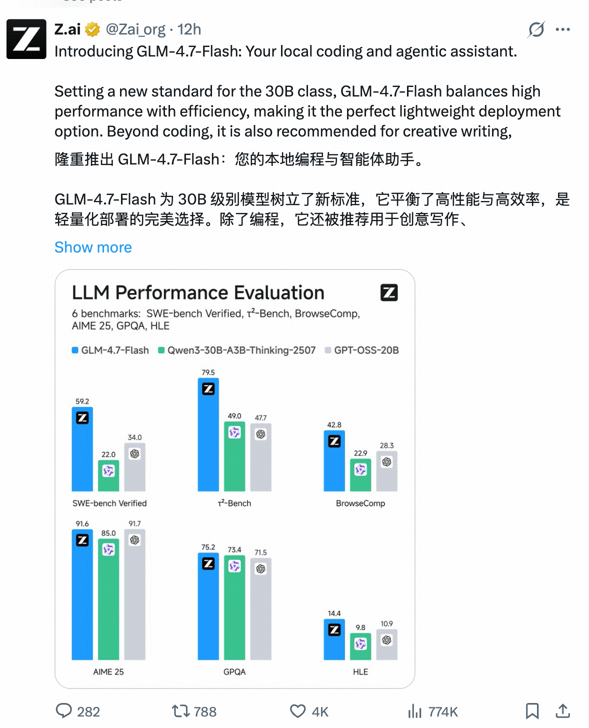 先看智谱今天发布的王炸新品——GLM-4.7-Flash,这玩意儿是真够顶的,直接把同级开源模型的性能拉到了新高度。它用的是混合专家架构(MoE),总参数30B,实际干活只激活3B。翻译成人话就是:就像一个天才脑子里存了300亿本书,却只挑最管用的30亿本来看,既聪明又省资源,不管是端侧还是云端,用着都顺手。