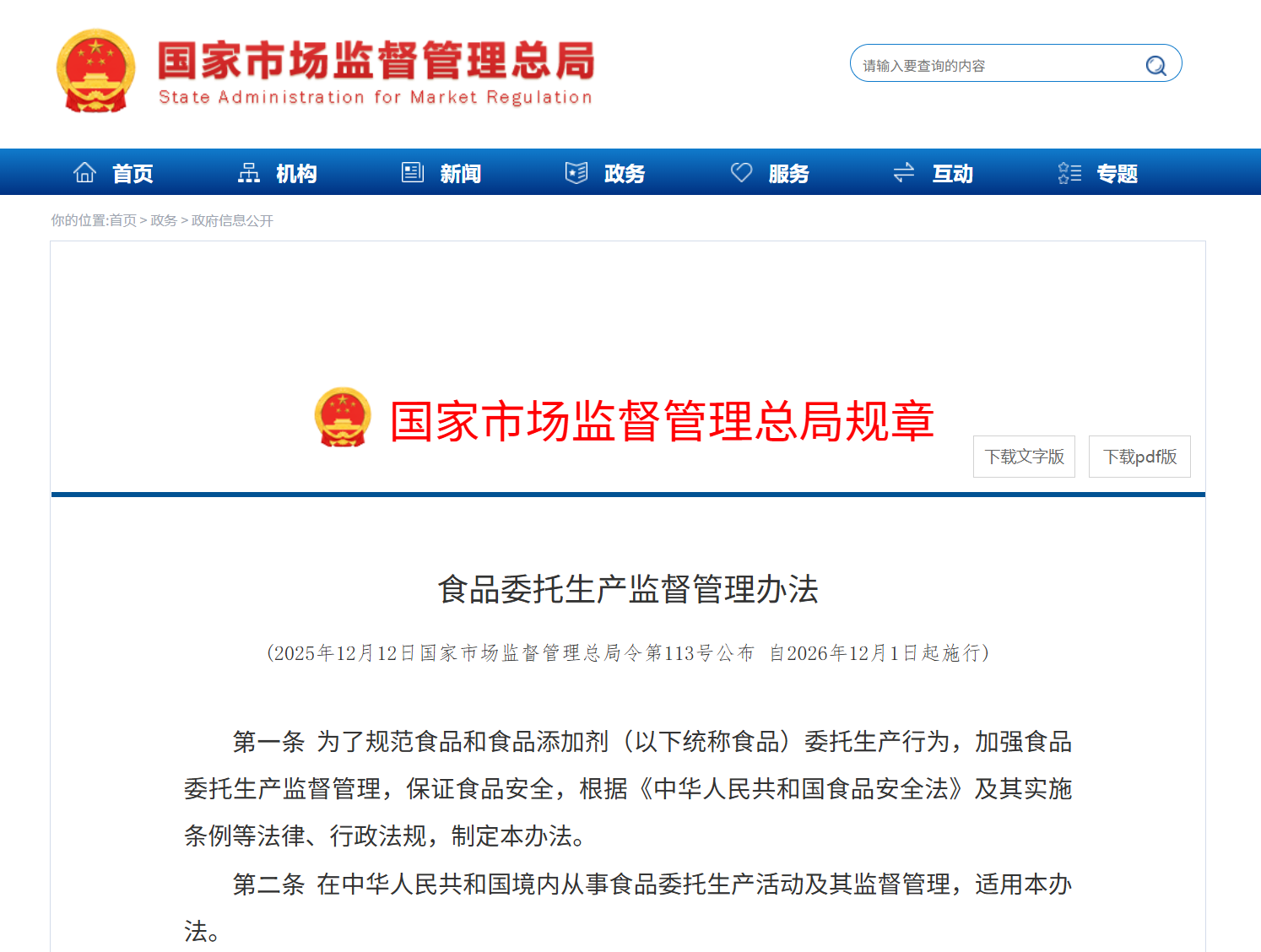 日前,国家市场监管总局发布《食品委托生产监督管理办法》,将从2026年12月1日起实施。白酒作为食品范畴的特殊品类,这份新规,以权责清晰、全程可溯为核心,对白酒委托生产的资质审核、过程监管、标签标识等作出全面规范。在行业处于深度调整周期的背景下,新规的落地不仅将终结贴牌产业的野蛮生长,更将推动整个白酒行业向品质竞争、合规经营的方向深度转型。