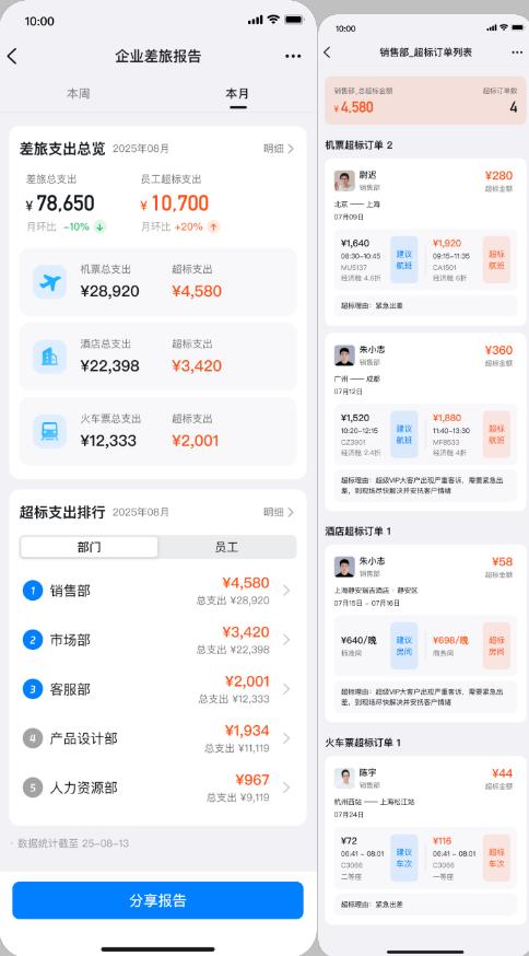 另一方面来自差旅支出的透明化。钉钉平台能自动生成差旅报告,自动统计超标预定的数据,可按部门、员工查看排行榜及明细,差旅花费透明可控,让管理者心中有数。