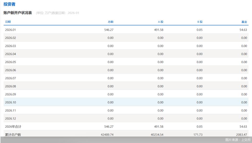 从公开数据显示,2026年1月上交所A股新开户数达到491.58万户,同比增长213.11%,环比增加89.31%。该单月开户数据不仅较去年1月和12月份出现了显著增加的迹象,而且还比2025年全年的单月新开户数据还要多。按照2026年1月份的新开户数据计算,491.58万户的新开户数仅次于2024年10月份。