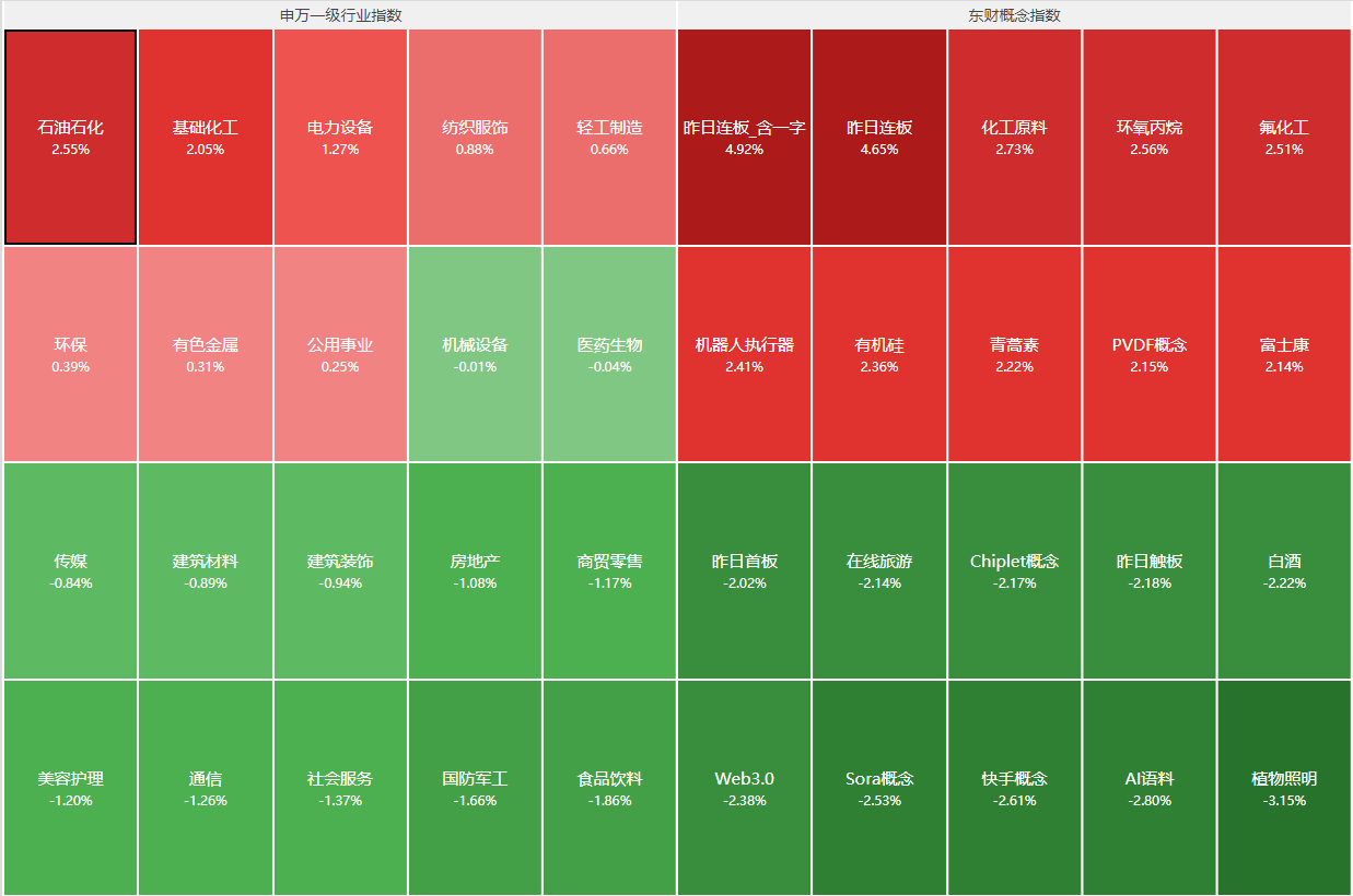 分行业来看,石油石化、基础化工、电力设备、纺织服饰、轻工制造等行业领涨,食品饮料、国防军工、社会服务等行业领跌。