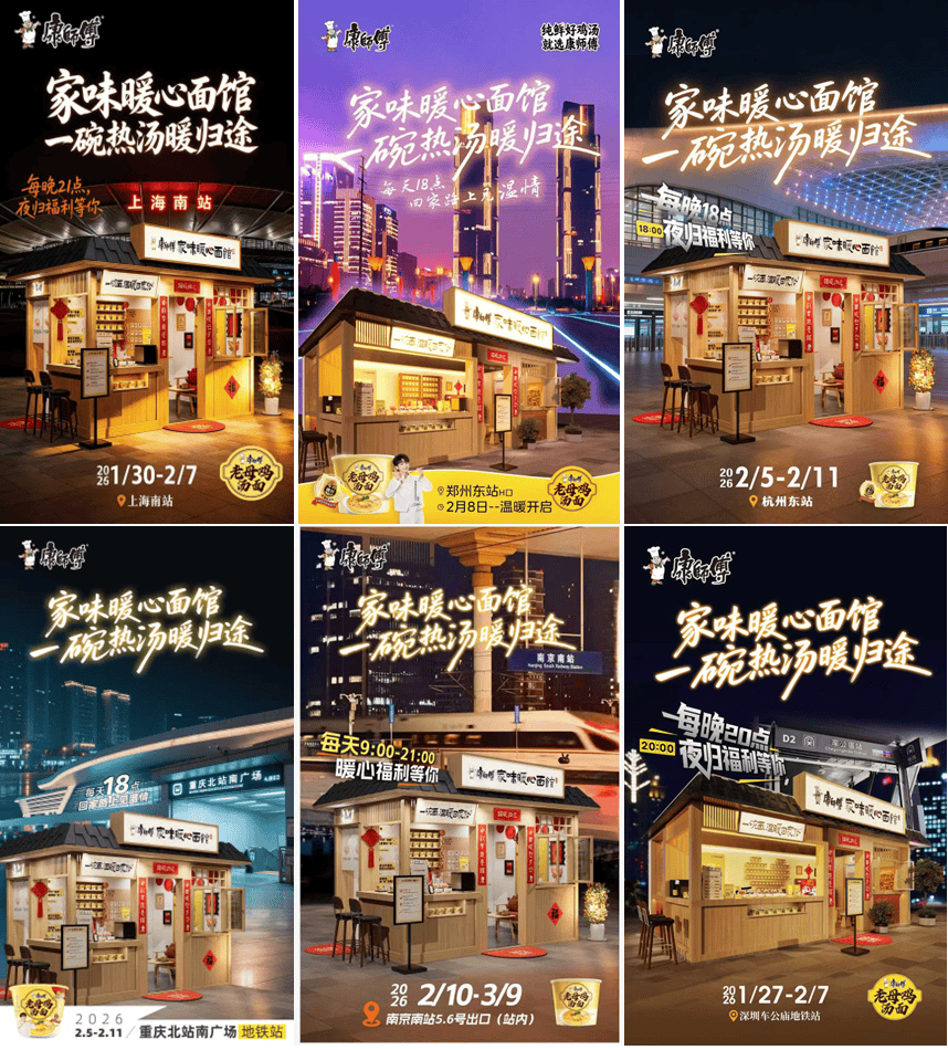 从空间到产品,从功能到心意,康师傅做的所有事似乎都指向同一个方向——它把“家”这个抽象的字,拆解成一碗鸡汤、满电的安全感、熟悉的乡音和温暖的陪伴……然后再耐心地,一点点把它们重新拼回每个人手中。