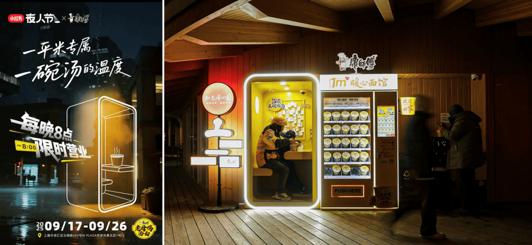 这份温暖并非偶然。它源自康师傅去年在城市里悄悄亮起的“1㎡暖心面馆”——那些深夜仍为外卖骑手、代驾司机、加班打工人留着的独处空间。这个让人能短暂歇脚喘息的空间,曾是城市夜晚最安静的陪伴,也收获了大量的点赞和好评。