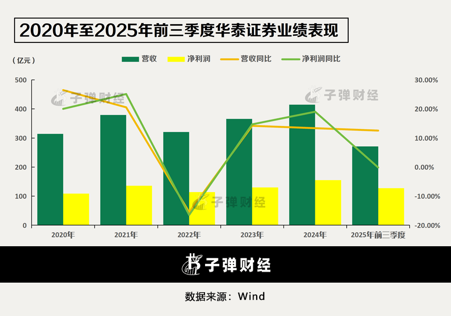 财报显示,2025年前三季度,华泰证券营收和净利润分别为271.29亿元、127.21亿元,同比增速分别为12.55%、-0.13%。