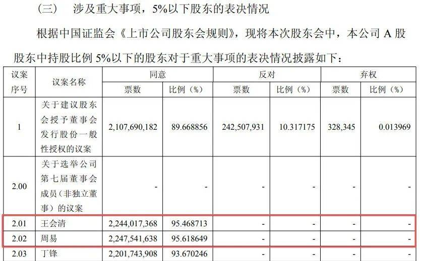 而在持股比例5%以下股东的表决中,周易的得票率为95.61%,同样略高于王会清的95.46%。